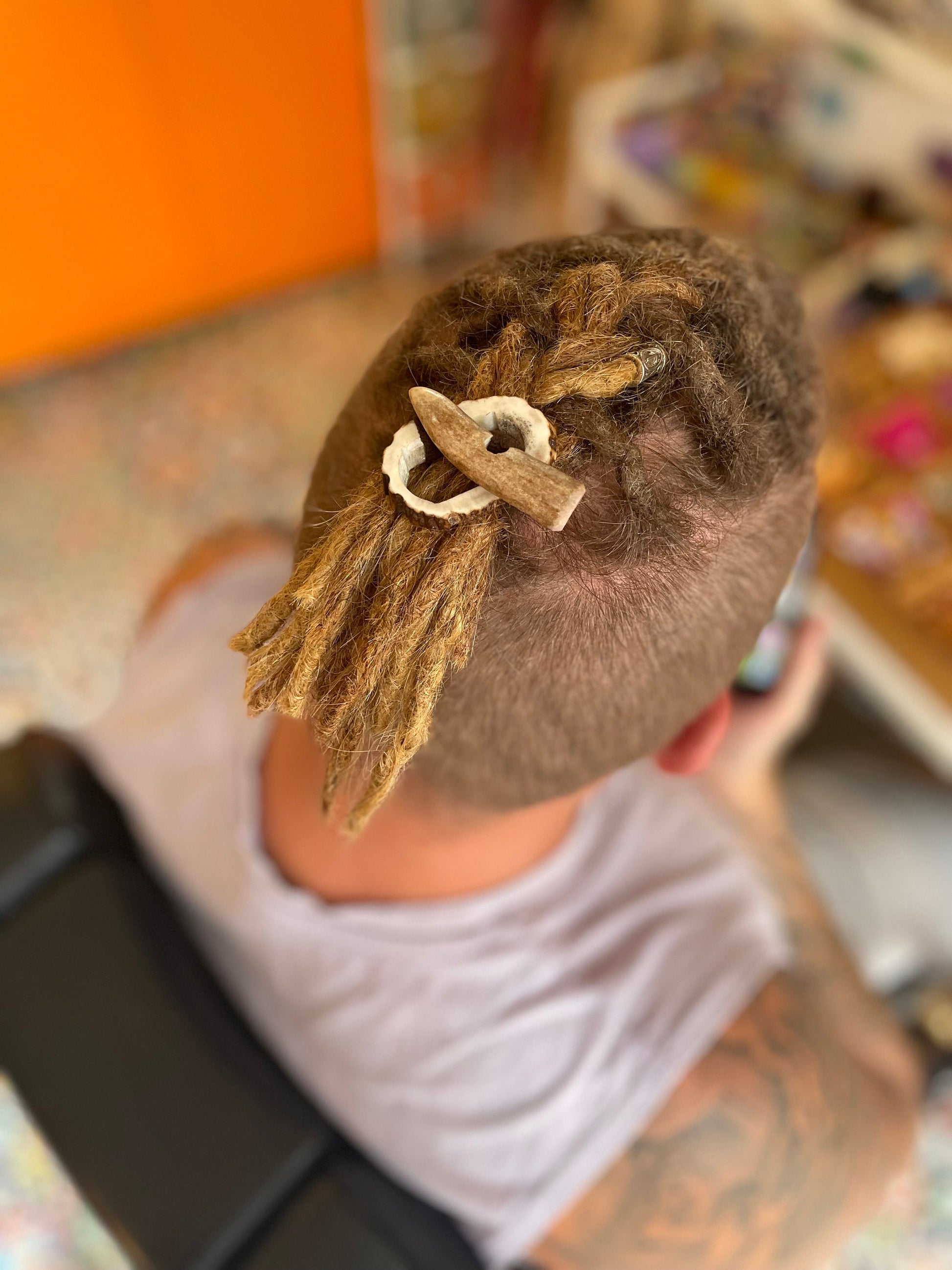 Ethically sourced these antler toggle ties make a stunning statement piece to dreadlocks or undreadlocked hair. totally adjustable in how much hair to hold, simply thread through the hole to reduce the elastic. Due to individuality, each piece will vary from picture however will be minimum of 2.5” diameter