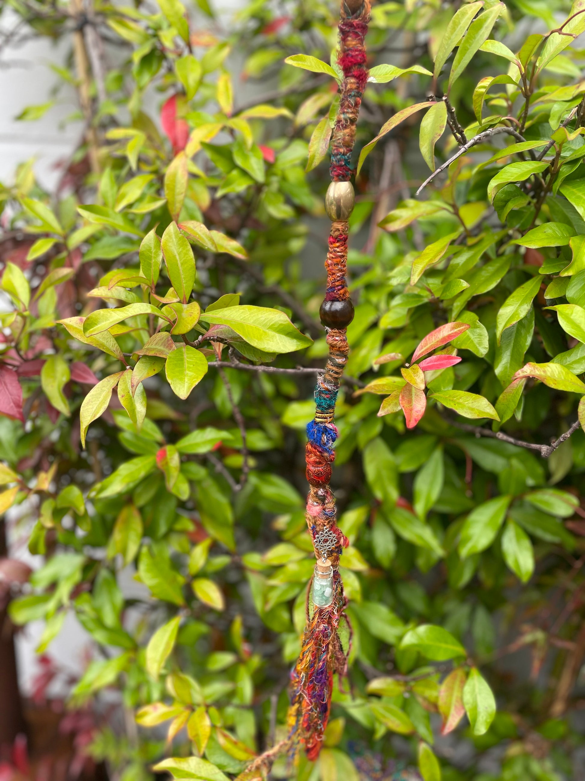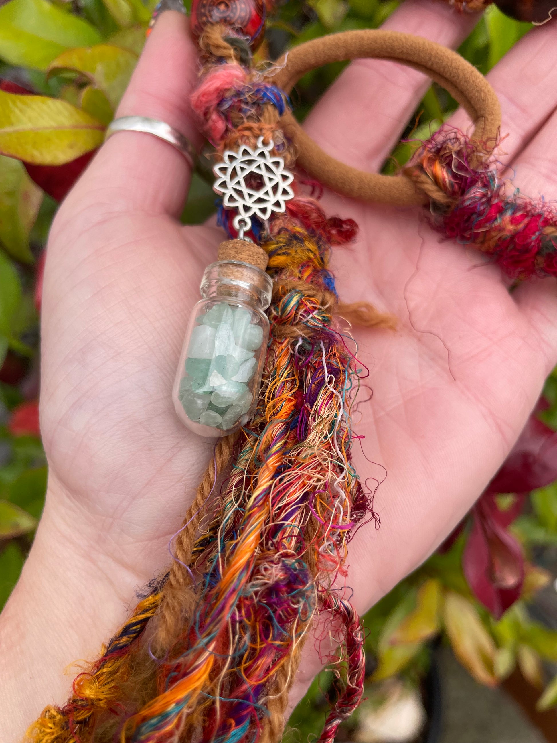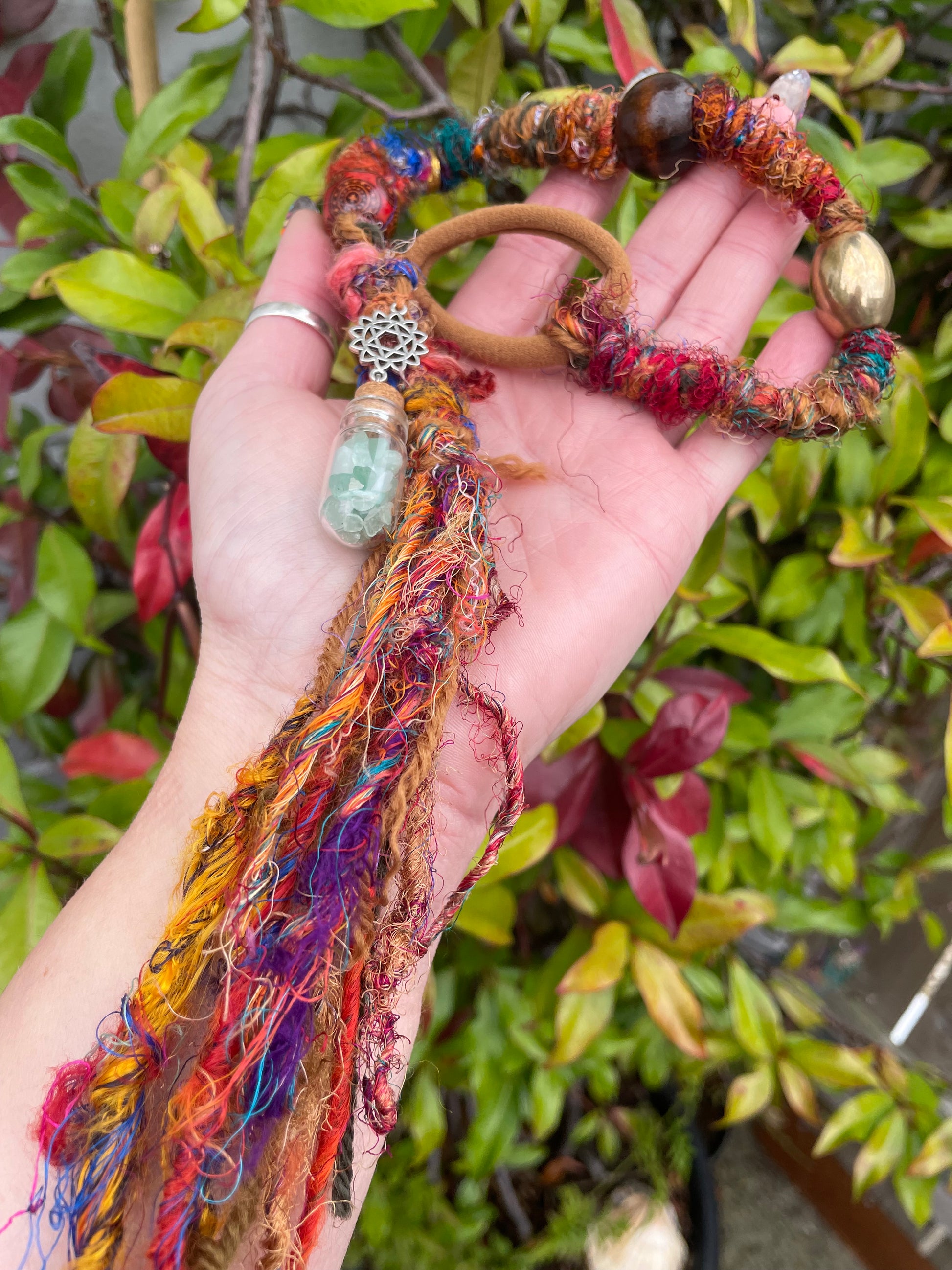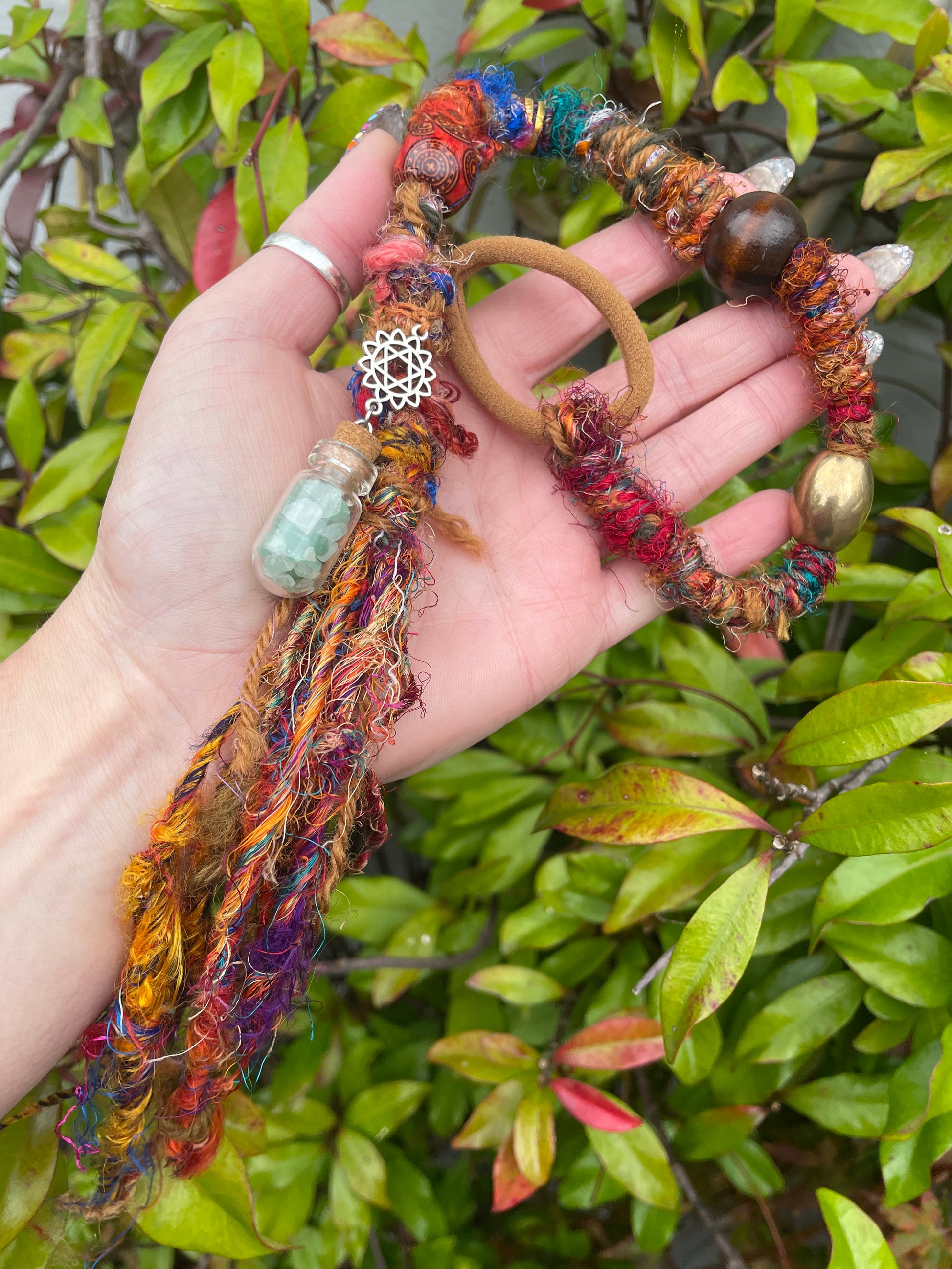 Up cycled hair wrap made from gorgeous multi tone sari silk threads and other fabric waste. Decorated with golden beads & a secret stash glass bottle filled with aventurine crystal chips for a little healing on the go
